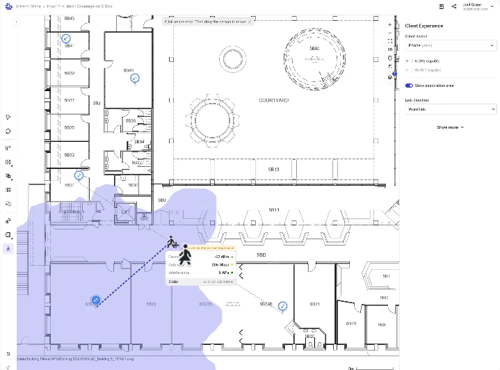 Client View - Simulate client roaming behavior on your network. Move the client to see how devices like iPhones, iPads, and Android handsets choose to roam.