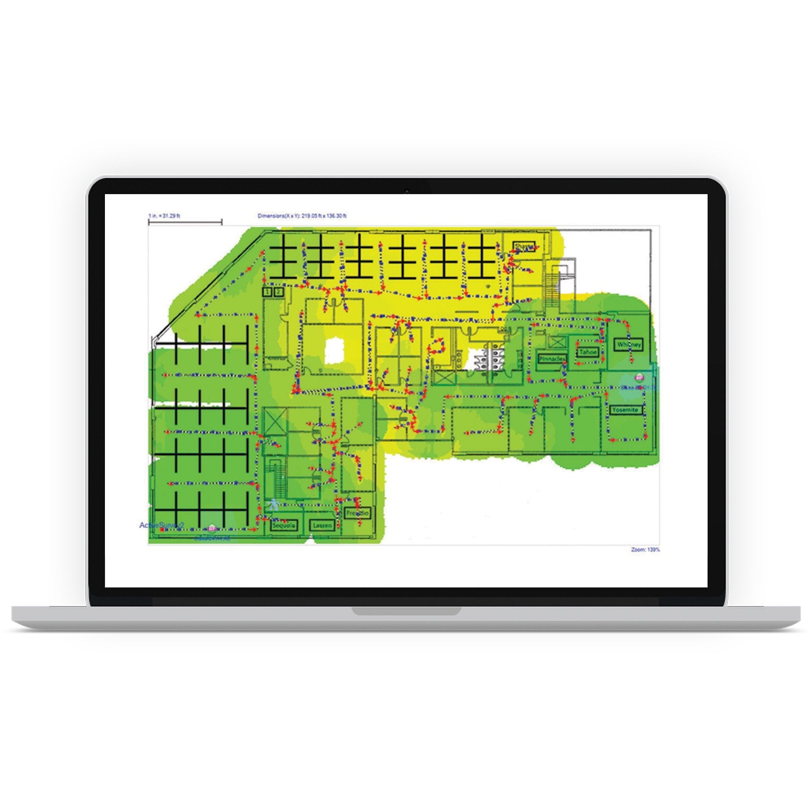 - Create heatmaps that show full WLAN coverage, noise, SNR, interference, throughput, data rates, retries, loss, and more on the 2.4/5/6 GHz bands.