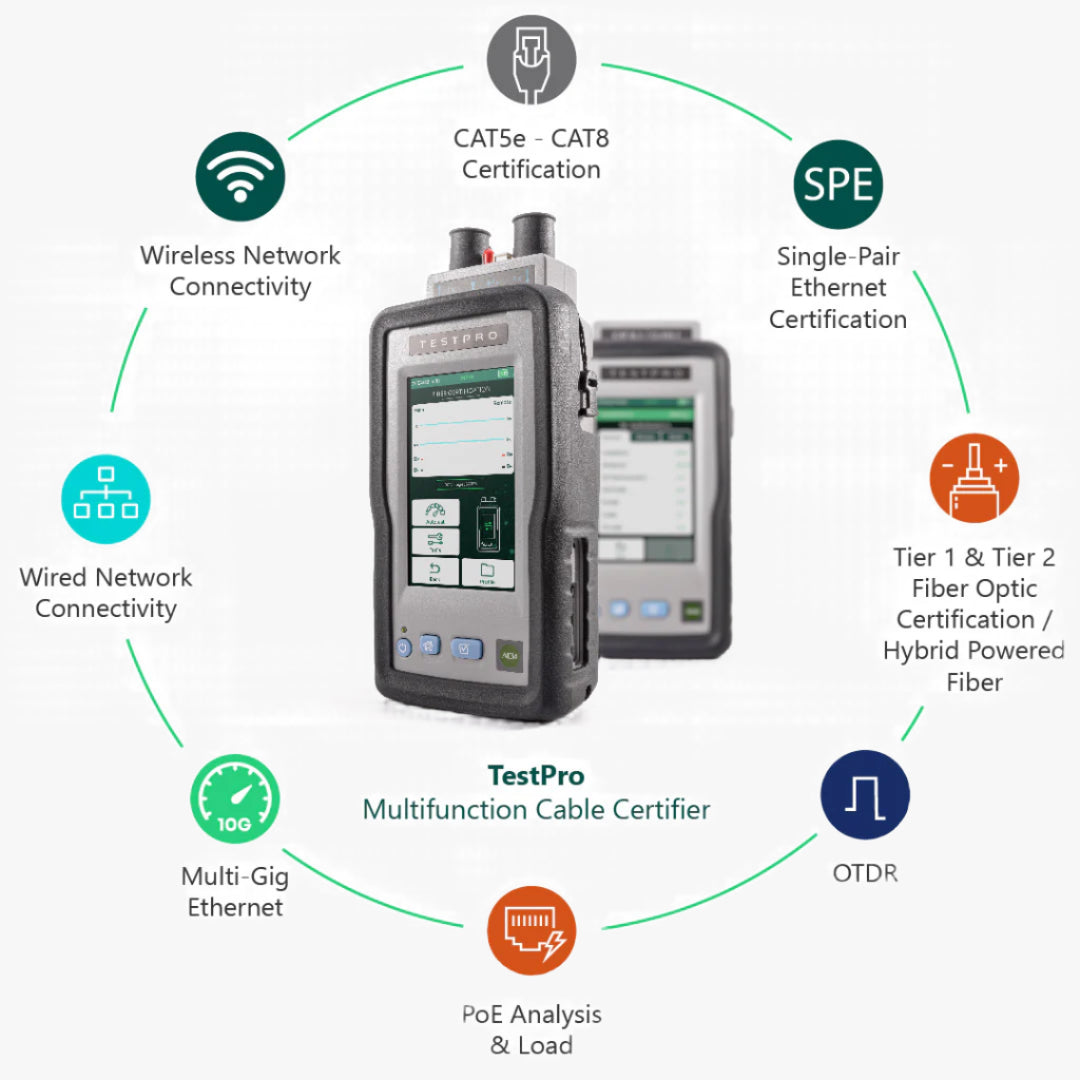 The award winning TestPro CV100 Multifunction Cable Certifier is purpose-built for today’s modern Smart Building network infrastructure. It offers the most feature rich test platform available today, and the modular based platform allows for customization of the exact test suite needed.